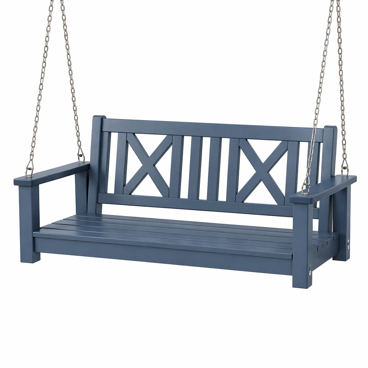 Diese hängende Bank besteht aus Kiefernholz mit verzinkten Stahlketten. Die Bank hat eine Länge von 120 cm, eine Breite von 60 cm und eine Höhe von 60 cm. Sie wiegt 25 kg und kann bis zu 200 kg tragen. Die Farbe ist Blau und das Design umfasst Armlehnen und eine Rückenlehne.